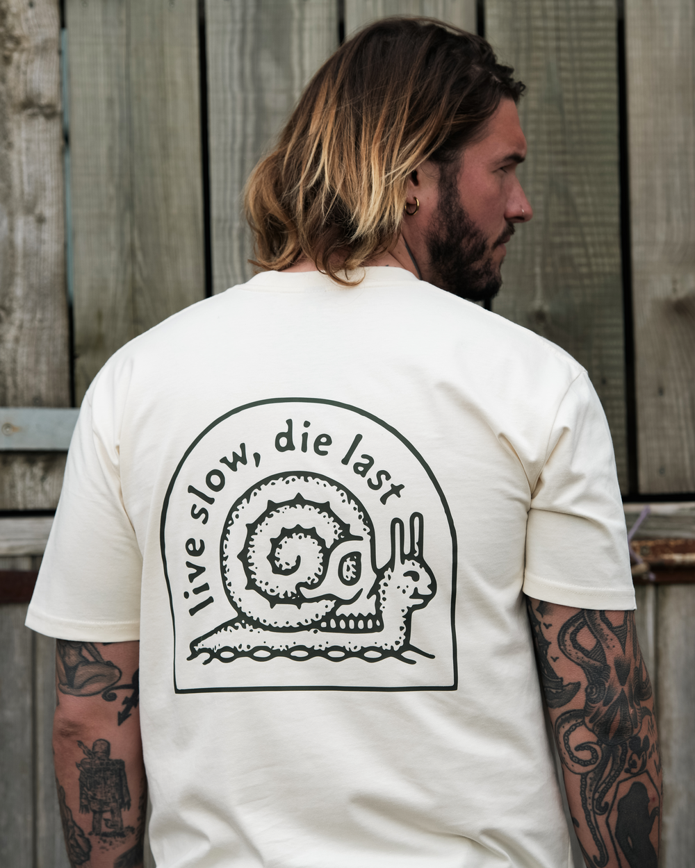LIVE SLOW, DIE LAST - FRONT & BACK - ECRU T-SHIRT - DELUXE HEAVY